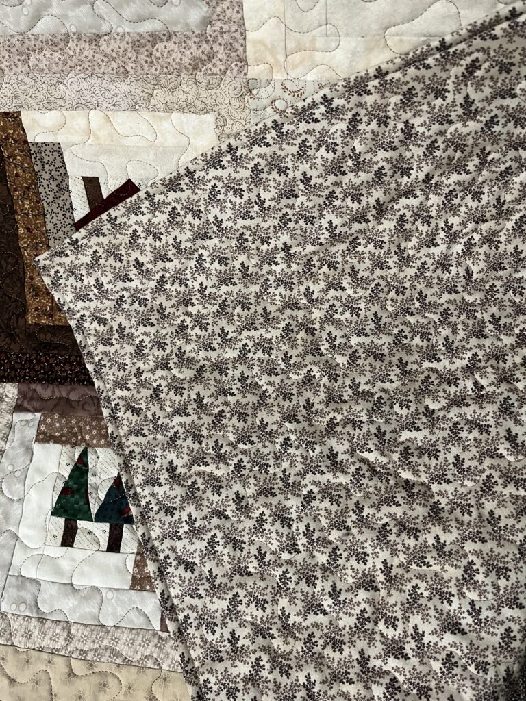 The first photo shows the detail of the machine quilting that will enhance the top of the quilt. The second photo shows the backing.